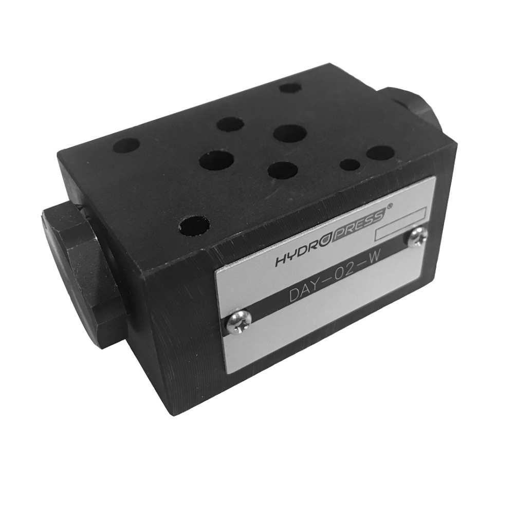 Hydraulický zámek DAY-01-W modulový, neboli mezi deskový se používá buď jako bezpečnostní prvek k aretaci hydraulického válce pře prasknutím hadice, nebo také k uzamčení tlaku. Tyto hydraulické zámky mají nulovou lekáž. Aby bylo možne hydraulický zámek odemknout, musíme přivést tlak do druhého vstupu zámku, tím dojde k otevření.